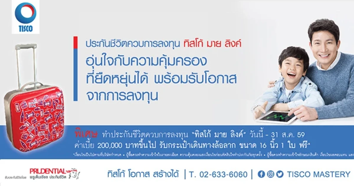 ทำประกันชีวิตควบการลงทุน "ทิสโก้ มาย ลิงค์" ค่าเบี้ยประกัน 2 แสนบาทขึ้นไป รับฟรีกระเป๋าล้อลาก 16 นิ้ว