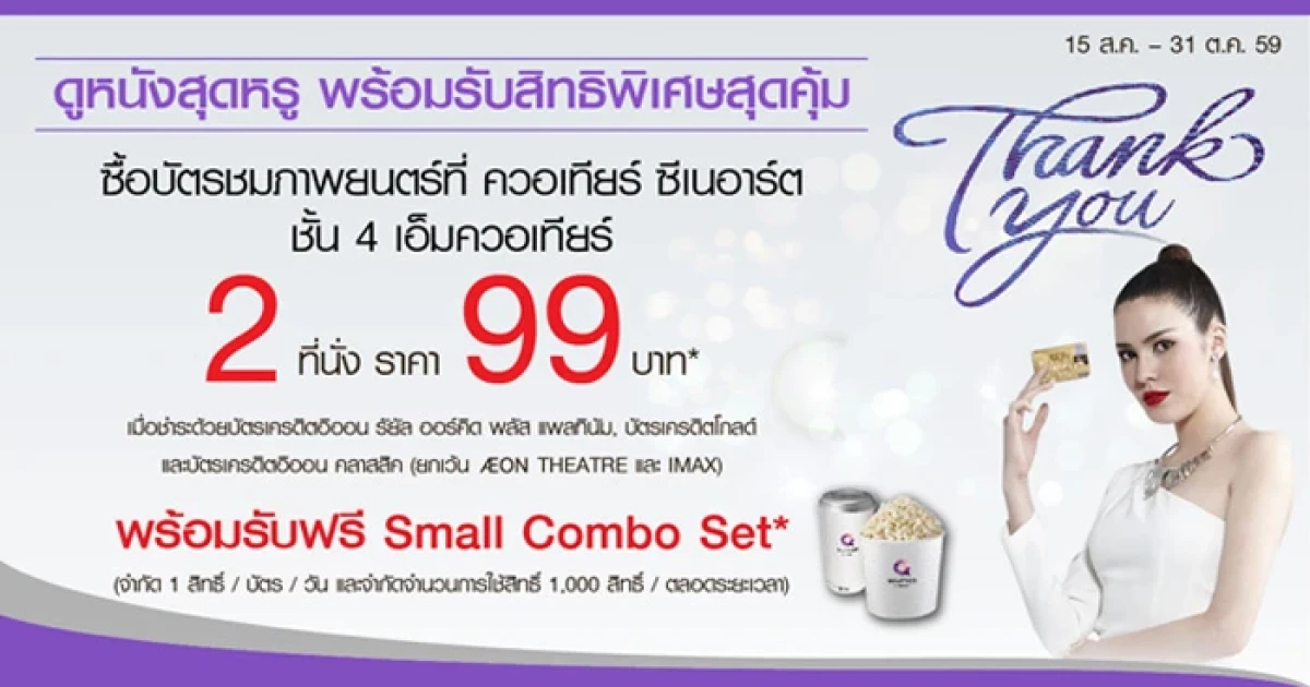 - รับสิทธิ์ซื้อบัตรชมภาพยนตร์ ในโรงภาพยนตร์ Quartier CineArt ได้ในราคา 99 บาท/ 2 ที่นั่ง (1 คู่) เมื่อชำระด้วย บัตรเครดิตอิออน รอยัล ออร์คิด พลัส แพลทินัม, บัตรเครดิตโกลด์ และ บัตรเครดิตอิออน คลาสสิค (วีซ่า/มาสเตอร์การ์ด/เจซีบี) สำหรับที่นั่งราคาปกติ (จำกัด 1 สิทธิ์ /หมายเลขบัตร/วัน ) และจำกัดจำนวนการให้สิทธิ์ทั้งหมด 1,000 สิทธิ์/เดือน)