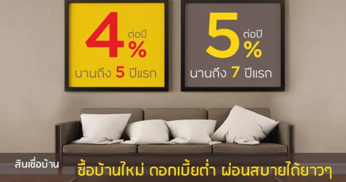 - ลูกค้าสามารถเลือกรับอัตราดอกเบี้ย 4% ต่อปี ปีที่ 1 - 5 หลังจากนั้นอัตราดอกเบี้ย MRR - 1.60% ต่อปี หรืออัตราดอกเบี้ย 5% ต่อปี ปีที่ 1 ? 7 หลังจากนั้นอัตราดอกเบี้ย MRR - 1.60% ต่อปี สำหรับหลัก ประกันประเภทบ้านเดี่ยว บ้านแฝด ทาวน์เฮ้าส์ ทาวน์โฮม ห้องชุดพักอาศัย อาคารพาณิชย์ และโฮมออฟฟิศ