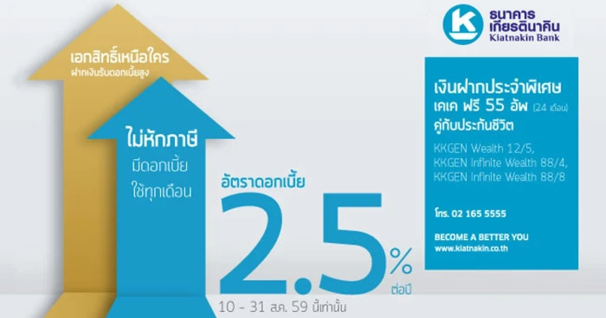 เงินฝากประจำพิเศษ เคเค ฟรี 55 อัพ (24 เดือน) คู่กับประกันชีวิต จาก ธนาคารเกียรตินาคิน มอบเอกสิทธิ์เหนือใคร ให้คุณรับอัตราดอกเบี้ยสูง 2.5% ต่อปี เมื่อเปิดบัญชีเงินฝากคู่กับการซื้อผลิตภัณฑ์ประกันชีวิต "เคเคเจน เวลท์ 12/5 หรือ เคเคเจน อินฟินิท เวลท์ 88/8 หรือ เคเคเจน อินฟินิท เวลท์ 88/4" ที่มีค่าเบี้ยประกันชีวิตขั้นต่ำ 200,000 บาท ภายในวัน และสาขาเดียวกัน