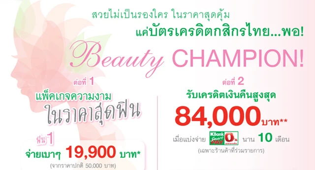 ซื้อแพ็คเกจความงามในราคาสุดฟิน พร้อมรับเครดิตเงินคืนสูงสุด 84,000 บาท จากบัตรกสิกรไทย