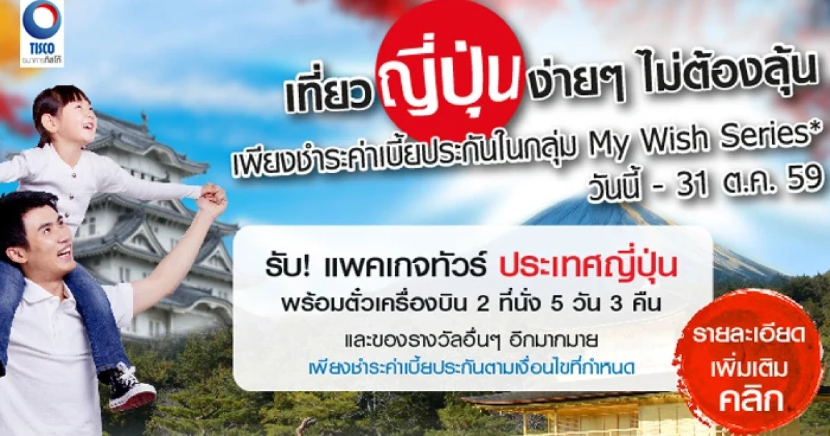 ธ.ทิสโก้ มอบแพคเกจทัวร์ประเทศญี่ปุ่น 5 วัน 3 คืน พร้อมตั๋วเครื่องบิน 2 ที่นั่ง และของรางวัลอื่นๆ อีกมากมาย เพียงชำระค่าเบี้ยประกันในกลุ่ม My Wish Series ตามเงื่อนไขที่กำหนด