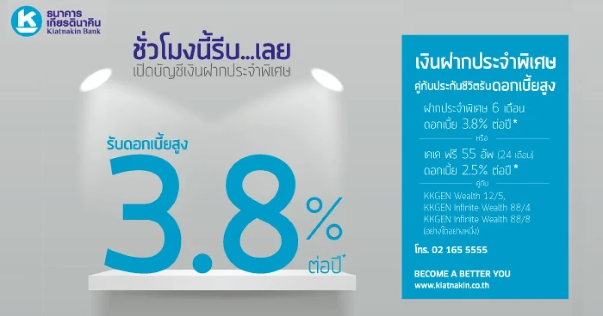 รีบเลย! เปิดบัญชีเงินฝากประจำพิเศษคู่กับประกันชีวิต จาก ธ.เกียรตินาคิน รับดอกเบี้ยสูงสุด 3.8% ต่อปี