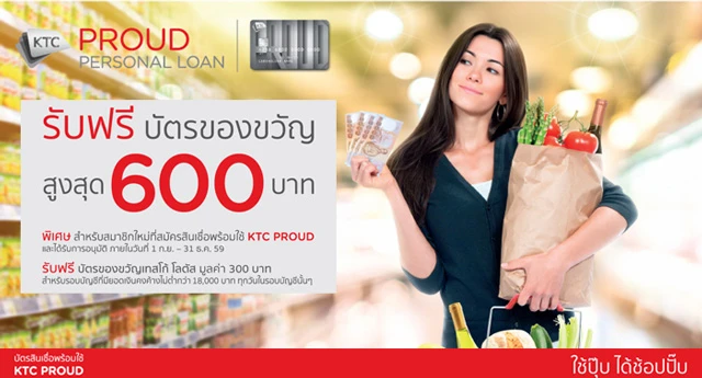สมัครบัตรสินเชื่อพร้อมใช้ KTC PROUD วันนี้ รับฟรี บัตรของขวัญเทสโก้ โลตัส มูลค่า 300 บาท สำหรับรอบบัญชีที่มียอดเงินคงค้างไม่ต่ำกว่า 18,000 บาท ทุกวันในรอบบัญชีนั้นๆ จำกัดบัตรของขวัญฯ สูงสุด 600 บาท / สมาชิก / ตลอดระยะเวลาส่งเสริมการขาย
