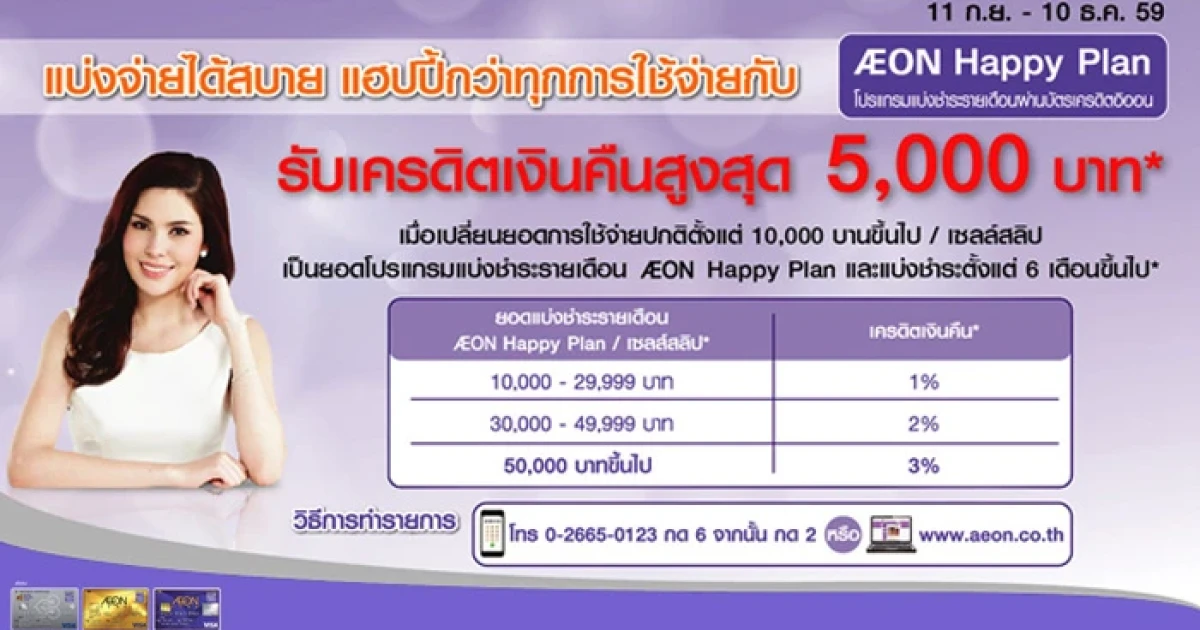 แบ่งจ่ายได้สบาย แฮปปี้กว่าทุกการใช้จ่าย กับ AEON Happy Plan รับเครดิตเงินคืนสูงสุด 5,000 บาท เมื่อเปลี่ยนยอดการใช้จ่ายปกติตั้งแต่ 10,000 บาทขึ้นไป/ เซลล์สลิป เป็นยอดโปรแกรมแบ่งชำระรายเดือนตั้งแต่ 6 เดือนขึ้นไป จากบัตรเครดิตอิออน