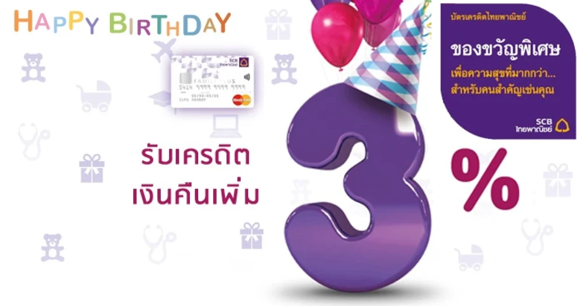 รับเงินคืนเพิ่ม 3% เมื่อมียอดใช้จ่ายในวันคล้ายวันเกิด ของขวัญสุดพิเศษ จากบัตรฯ ไทยพาณิชย์แฟมิลี่ พลัส
