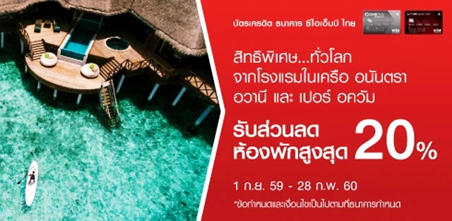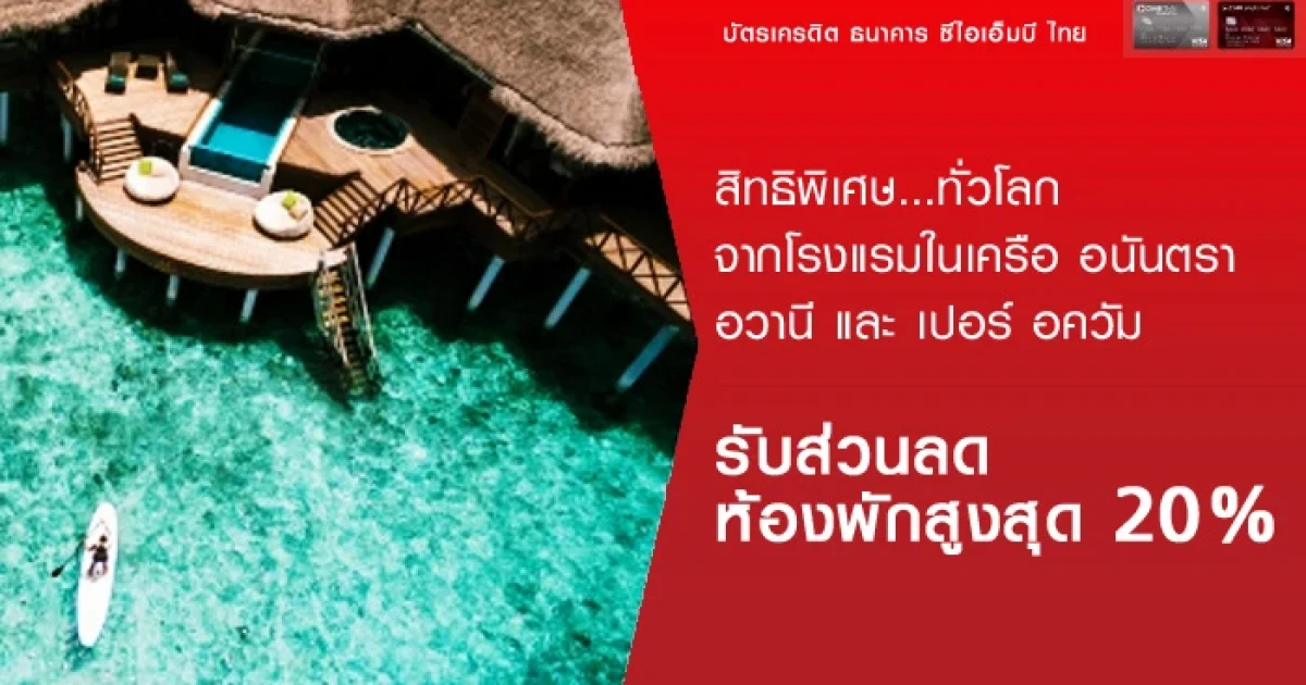 รับส่วนลดสูงสุด 20% และสิทธิพิเศษ.. ทั่วโลก จากโรงแรมในเครือ อนันตรา อวานี และเปอร์ อควัม สัมผัสบรรยากาศโรงแรมหรู ในจุดหมายที่คุณประทับใจ กับบัตรเครดิตธนาคารซีไอเอ็มบี ไทย โดยจะขอยกตัวอย่างโรงแรมแต่ละแห่งที่ร่วมรายการโปรโมชั่นมาให้ชม ตามรายละเอียดดังนี้