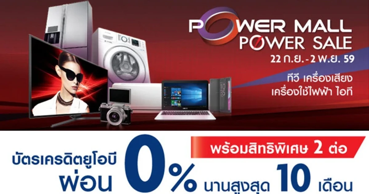 สิทธิพิเศษสำหรับผู้ถือบัตรเครดิตยูโอบี ผ่อน 0% นานสูงสุด 10 เดือน พร้อมรับสิทธิพิเศษ 2 ต่อ เมื่อช้อปสินค้าที่ร่วมรายการ อาทิ ทีวี เครื่องเสียง เครื่องใช้ไฟฟ้า และสินค้าหมวดไอที ที่ Power Mall