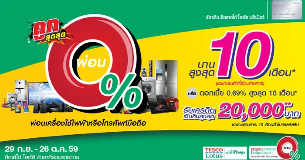 - บัตรสินเชื่อเทสโก้โลตัสพรีเมียร์ ผ่อนชำระอัตราดอกเบี้ย 0% นานสูงสุด 10เดือน เฉพาะสินค้าที่ร่วมรายการ