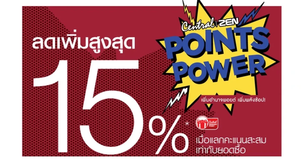 เพิ่มอำนาจพอยท์ เพิ่มพลังช้อป! รับส่วนลดเพิ่มสูงสุด 15% เมื่อใช้คะแนนสะสมแลกเท่ายอดซื้อ ที่เซ็นทรัลทุกสาขาและเซน สิทธิพิเศษจากบัตรเซ็นทรัล เครดิตคาร์ด