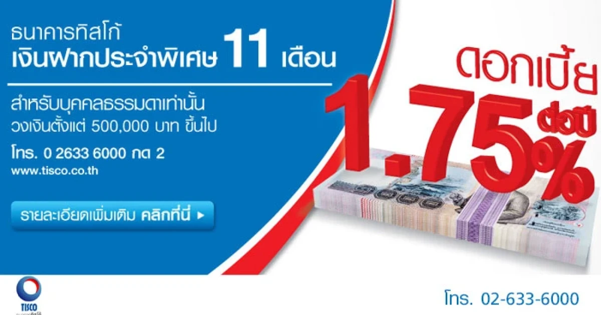 บัญชีเงินฝากประจำพิเศษ 11 เดือน จาก ธ.ทิสโก้ วงเงินฝาก 5 แสนบาทขึ้นไป รับดอกเบี้ยสูง 1.75% ต่อปี