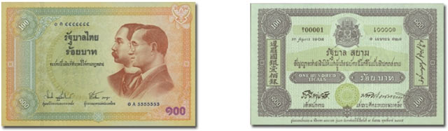 ภาพด้านหน้า พระบรมฉายาสาทิสลักษณ์พระบาทสมเด็จพระเจ้าอยู่หัวภูมิพลอดุลยเดช คู่กับพระบาทสมเด็จพระจุลจอมเกล้าเจ้าอยู่หัว ในฉลองพระองค์ชุดสากล มีลักษณะเช่นเดียวกับธนบัตรแบบ 1 ชนิดราคา 100 บาท
