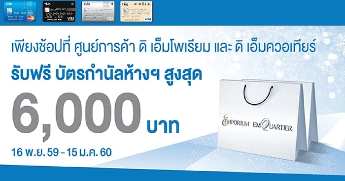รับฟรี! บัตรกำนัลห้างฯ สูงสุด 6,000 บาท เมื่อช้อปที่ศูนย์การค้า ดิ เอ็มโพเรียม และ ดิ เอ็มควอเทียร์ ตั้งแต่ 10,000 บาทขึ้นไป/ เซลล์สลิป ผ่านบัตรเครดิต TMB (จำกัดการรับบัตรกำนัลห้างฯ สูงสุด 6,000 บาท/ บัตร ตลอดรายการ)