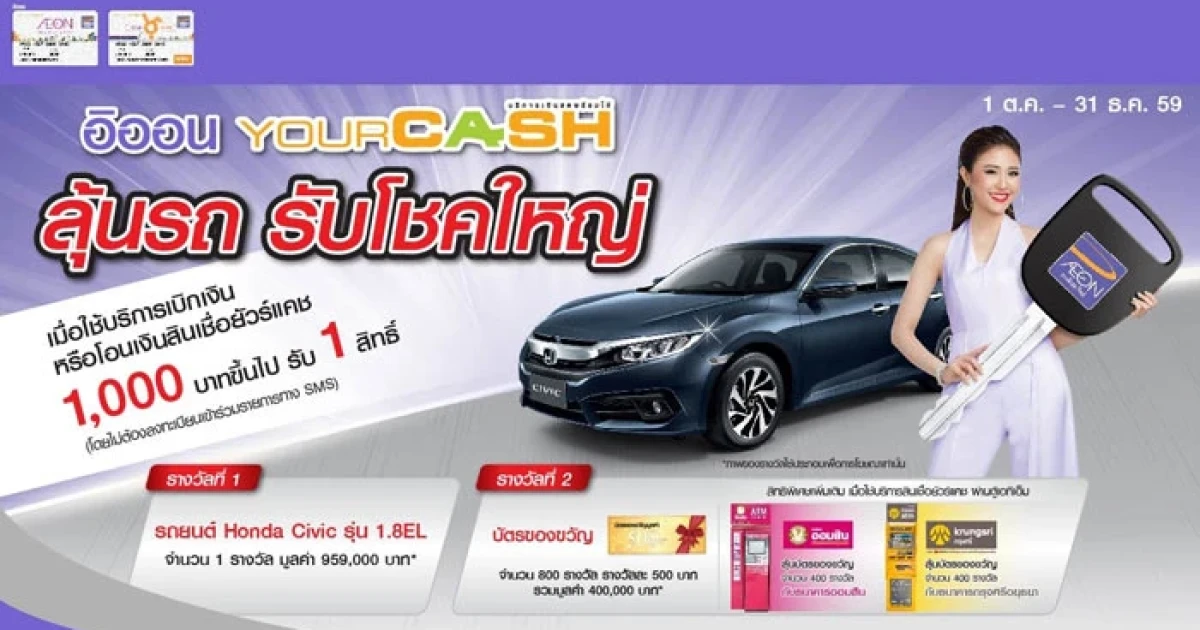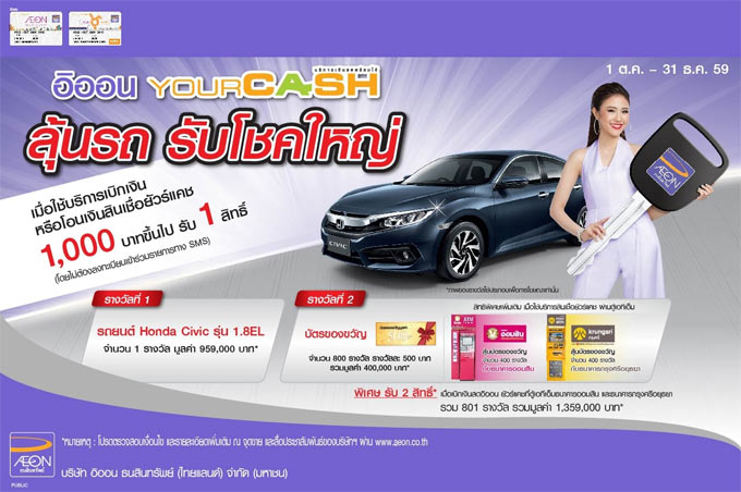 - รับ 1 สิทธิ์ : ลุ้นรับรถยนต์ Honda Civic 1.8EL สำหรับลูกค้าที่ใช้บริการเบิกเงินหรือโอนเงินสินเชื่อยัวร์แคช ตั้งแต่ 1,000 บาทขึ้นไป ตลอดระยะเวลาส่งเสริมการขาย (โดยไม่ต้องลงทะเบียนเข้าร่วมรายการทาง SMS) โดยสามารถใช้บริการสินเชื่อยัวร์แคชจากการกดเงินจากตู้เอทีเอ็มอิออนตู้เอทีเอ็มจากธนาคารกสิกรธนาคารกรุงเทพ ธนาคารกรุงไทย ธนาคารกรุงศรี ธนาคารธนชาต ธนาคารออมสิน ธนาคารไทยพาณิชย์หรือเบิกเงินจากเคาน์เตอร์เซอร์วิสในร้านเซเว่นอีเลฟเว่น หรือ โอนเงินให้ผู้รับเงินปลายทางรับที่ไปรษณีย์ไทยหรือบริการโอนเงินสินเชื่อยัวร์แคชระหว่างบัตรสมาชิกยัวร์แคชหรือ