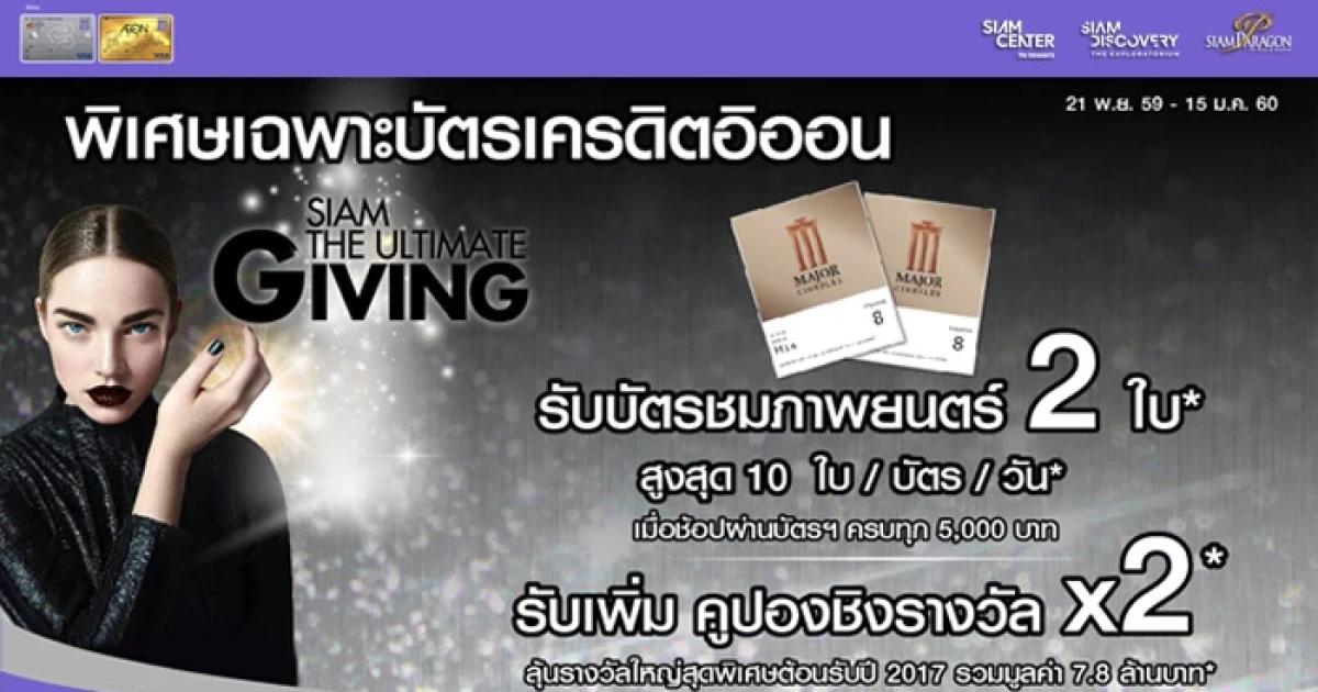 สิทธิพิเศษเฉพาะบัตรเครดิตอิออน ลุ้นรับบัตรชมภาพยนตร์ 2 ใบ และ รับเพิ่ม คูปองชิงรางวัล จำนวน 2 ใบ เมื่อช้อปผ่านบัตรฯ ที่ศูนย์การค้าสยามพารากอน, สยามเซ็นเตอร์ และสยามดิสคัฟเวอรี่ (ยกเว้นในโซนห้างสรรพสินค้า ไม่สามารถร่วมรายการได้)