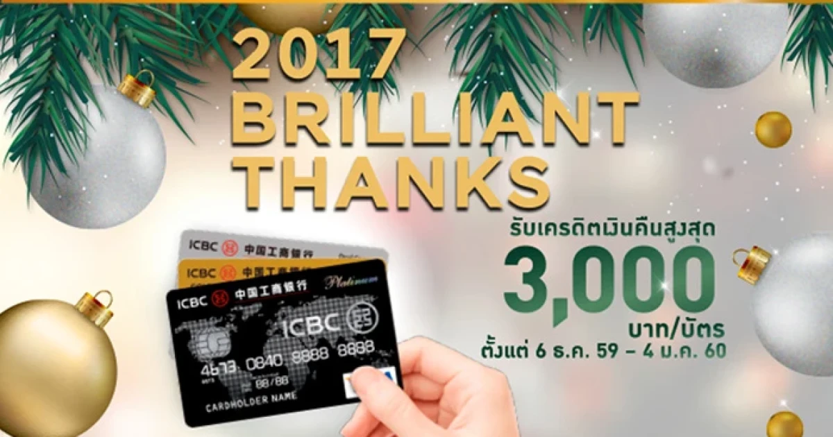 2017 Brilliant Thanks! รับเครดิตเงินคืนสูงสุด 3,000 บาท/ บัตร เมื่อใช้จ่ายผ่านบัตรเครดิตไอซีบีซี (ไทย) ณ ห้างสรรพสินค้าที่ร่วมรายการ อาทิ เดอะมอลล์, ดิ เอ็มโพเรียม, เอ็มควอเทียร์, สยามพารากอน และบลูพอร์ต