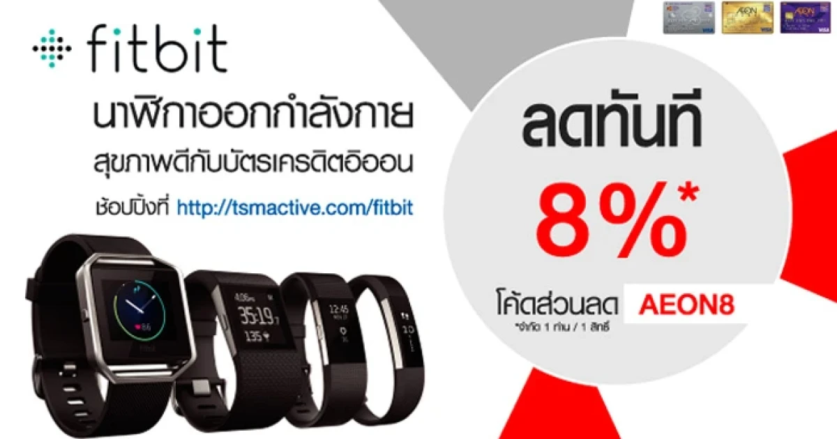 สิทธิพิเศษสำหรับสมาชิกผู้ถือบัตรเครดิตอิออน รับส่วนลด 8% เมื่อช้อปสินค้า fitbit ผ่านเว็บไซต์ http://tsmactive.com/fitbit โดยใช้โค้ดส่วนลด "AEON8" และชำระผ่านบัตรเครดิตอิออน