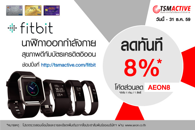 - สิทธิพิเศษนี้ สำหรับสมาชิกที่ซื้อสินค้า Fitbit ผ่านเว็บไซต์ http://tsmactive.com/fitbit รับส่วนลด 8% ทันที เมื่อกรอกโค้ดส่วนลด "AEON8" ในขั้นตอนสุดท้ายของการสั่งซื้อ และชำระเงินด้วยบัตรเครดิตอิออน