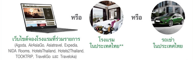 - ยอดใช้จ่ายที่เป็นการซื้อหรือจองโรงแรม รถเช่า ผ่านบริษัททัวร์ (Travel Agency) หรือเว็บไซต์ของบริษัททัวร์ ไม่สามารถร่วมรายการส่งเสริมการขายนี้ได้