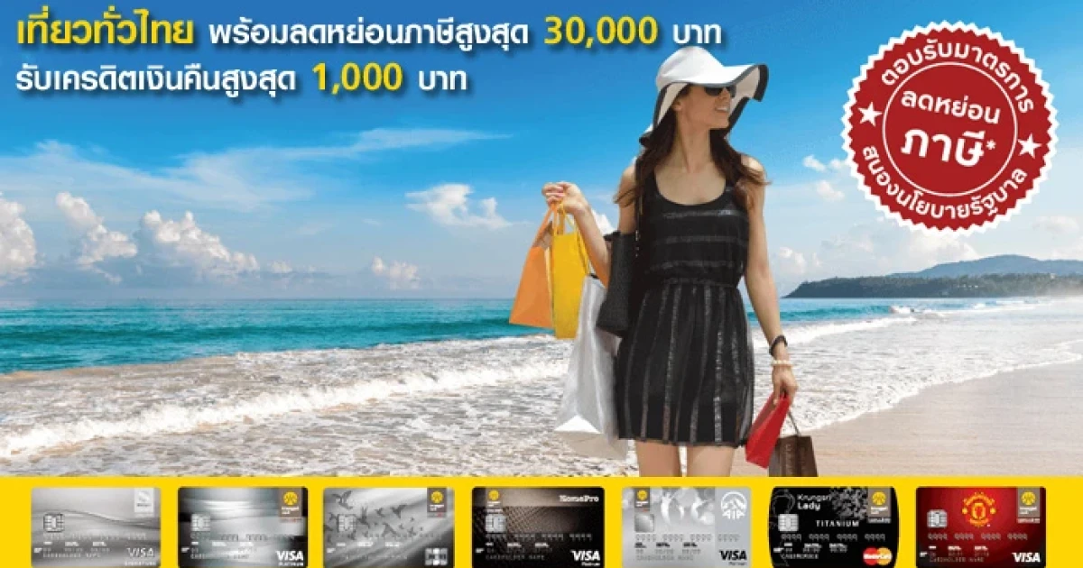 เที่ยวทั่วไทย.. ใช้สิทธิ์ลดหย่อนภาษีได้สูงสุด 30,000 บาท พร้อมรับเครดิตเงินคืนสูงสุด 1,000 บาท เมื่อสะสมยอดใช้จ่ายครบทุกๆ 15,000 บาท ในหมวดท่องเที่ยวภายในประเทศ สิทธิพิเศษจากบัตรเครดิตกรุงศรี
