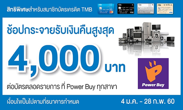 ช้อปกระจาย รับเครดิตเงินคืนสูงสุด 4,000 บาท ต่อบัตร ตลอดรายการ ที่ Power Buy ทุกสาขา สิทธิพิเศษจากบัตรเครดิต TMB *รับเงินคืนสูงสุด 1 สิทธิ์/ บัตร/ เดือน (รวมสูงสุด 2 สิทธิ์/ บัตรตลอดรายการ)