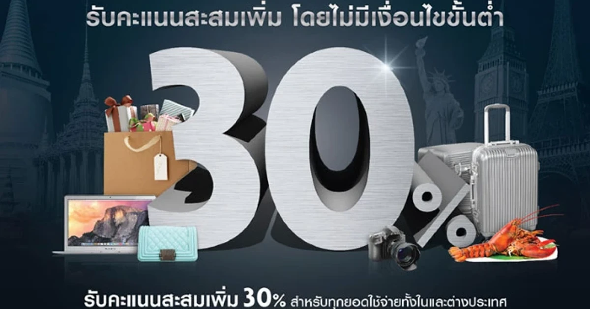 - ยอดใช้จ่ายที่นำมาคำนวณคะแนนสะสมเพิ่ม 30% ในรายการนี้ต้องอยู่ระหว่างวันที่ 15 พฤศจิกายน 59 - 31 มกราคม 2560 โดยยึดถือวันที่ทำรายการขออนุมัติ (Transaction Date) เท่านั้น โดยไม่รวมรายการจากการใช้จ่ายที่เกิดจากหมวดน้ำมัน, กองทุนต่างๆ, รายการผ่อนชำระที่เกิดขึ้นก่อนวันที่ 15 พ.ย.59, ยอดเบิกเงินสดล่วงหน้า, ดอกเบี้ย, ค่าปรับ, ค่าธรรมเนียมทุกประเภท และรายการที่ถูกยกเลิกภายหลัง