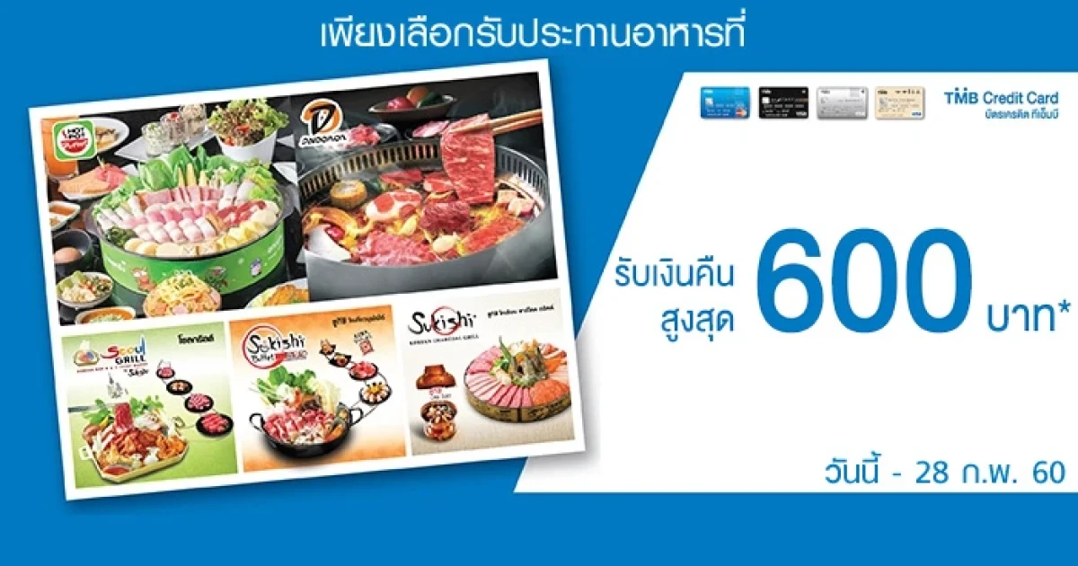 รับเงินคืนสูงสุด 600 บาท เมื่อรับประทานอาหาร ณ ร้านอาหารที่ร่วมรายการ อาทิ Hot Pot, Daidomon, Sukishi Buffet และ Seoul Grill ตั้งแต่ 1,000 บาทขึ้นไป/ เซลล์สลิป และชำระผ่านบัตรเครดิต TMB