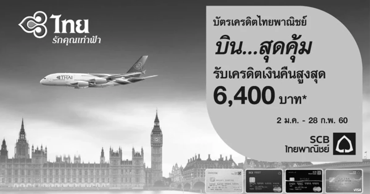 บิน.. สุดคุ้ม รับเครดิตเงินคืนสูงสุด 6,400 บาท เมื่อซื้อบัตรโดยสารการบินไทย ผ่าน www.thaiairways.com และมียอดใช้จ่ายสะสมตามที่กำหนด ผ่านบัตรเครดิตไทยพาณิชย์