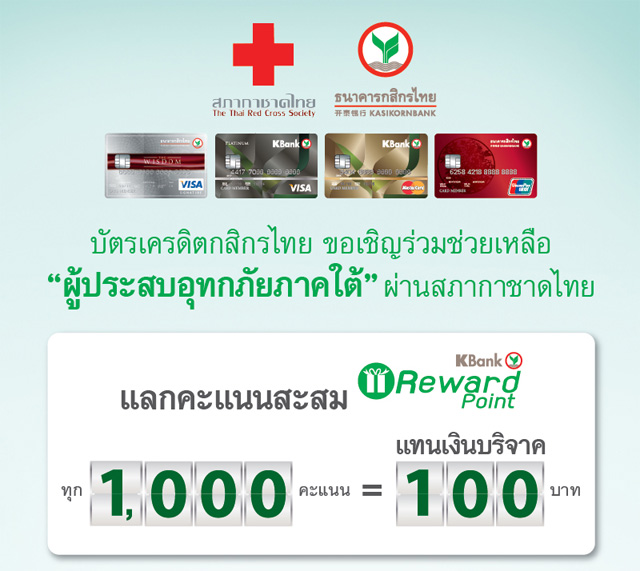 บัตรเครดิตกสิกรไทย ขอเชิญร่วมช่วยเหลือ "ผู้ประสบอุทกภัยภาคใต้" ผ่านสภากาชาดไทย ด้วยการแลกคะแนนสะสม KBank Reward Point ทุกๆ 1,000 คะแนน แทนเงินบริจาค 100 บาท