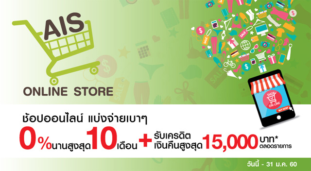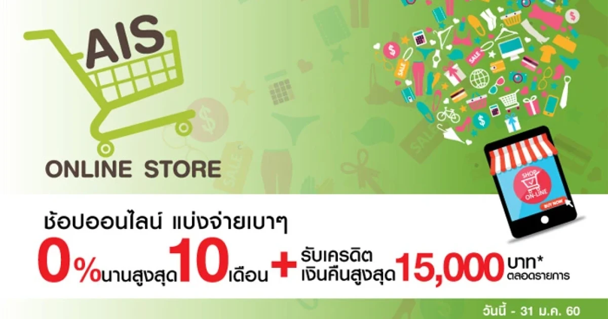 ช้อปออนไลน์ แบ่งจ่ายเบาๆ 0% นานสูงสุด 10 เดือน พร้อมรับเครดิตเงินคืนสูงสุด 15,000 บาท ที่ AIS Online Store สิทธิพิเศษจากบัตรเครดิตเทสโก้ โลตัส วีซ่า