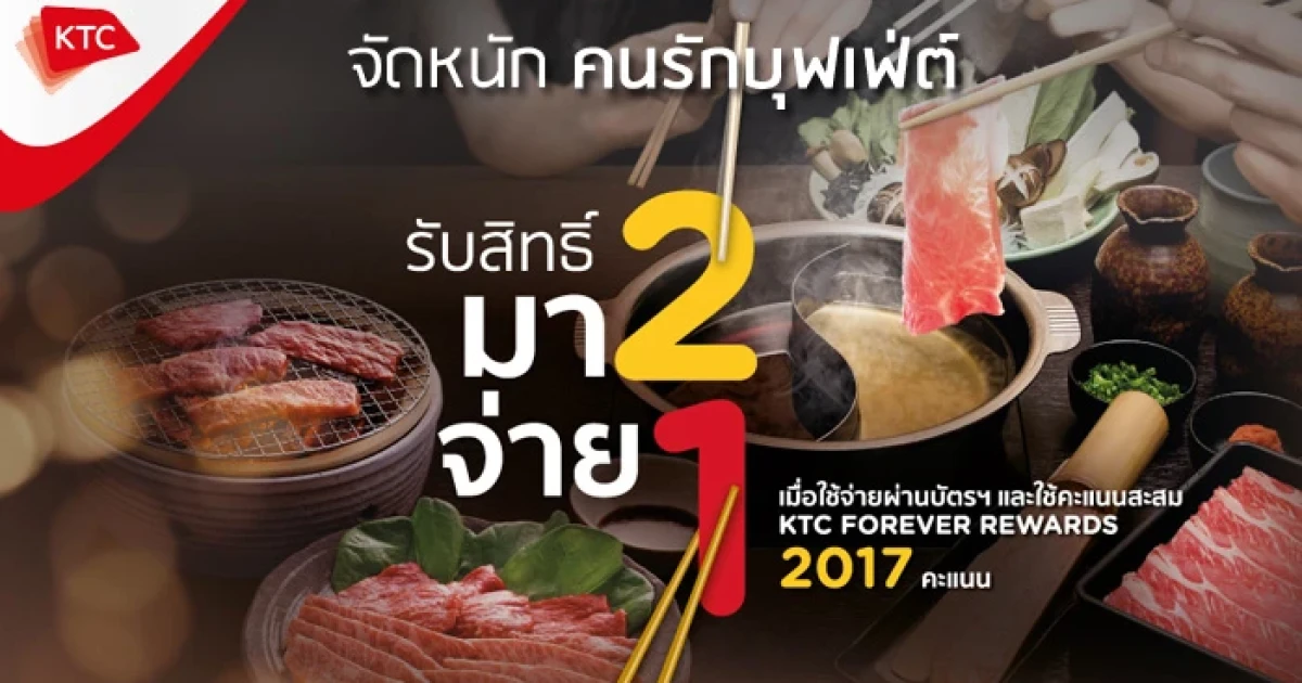 โปรจัดหนัก สำหรับคนรักบุฟเฟ่ต์! รับสิทธิ์ มา 2 จ่าย 1 เมื่อใช้จ่ายผ่านบัตรฯ และใช้คะแนนสะสม KTC Forever Rewards จำนวน 2017 คะแนน ณ ร้านค้าที่ร่วมรายการ อาทิ Kimju, Kimju Budaejjigae, Mo-Mo-Paradise, Sakura Yakiniku & Shabu Buffet, Sukishi Tokyo Buffet, Seoul Grill และ Red Kimchi สิทธิพิเศษจากบัตรเครดิต KTC