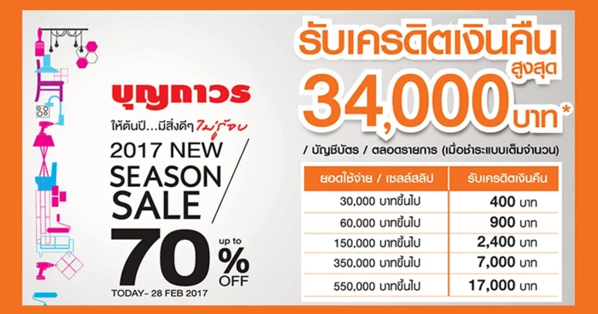 บุญถาวร ให้ต้นปี.. มีสิ่งดีๆ ไม่รู้จบ ลดสูงสุดถึง 70% รับเครดิตเงินคืนสูงสุด 34,000 บาท เมื่อซื้อสินค้าเต็มจำนวนที่ร้าน บุญถาวร ทุกสาขา และชำระผ่านบัตรเครดิตธนชาต