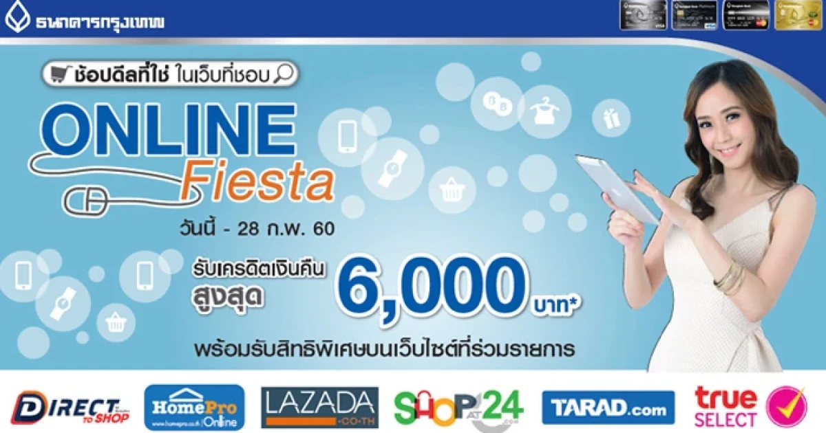 Online Fiesta รับเงินคืนสูงสุด 6,000 บาท พร้อมสิทธิพิเศษบนเว็บไซต์ที่ร่วมรายการ จากบัตรฯ ธ.กรุงเทพ