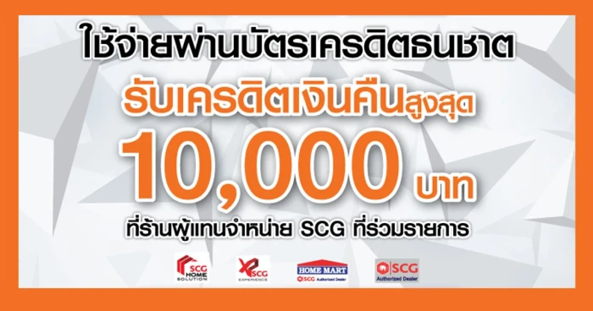 รับเครดิตเงินคืนสูงสุด 10,000 บาท เมื่อซื้อสินค้าที่ร้านผู้แทนจำหน่าย SCG ที่ร่วมรายการ อาทิ CEMENTHAI HOME MART และ SCG Experience Shop ผ่านบัตรเครดิตธนชาต
