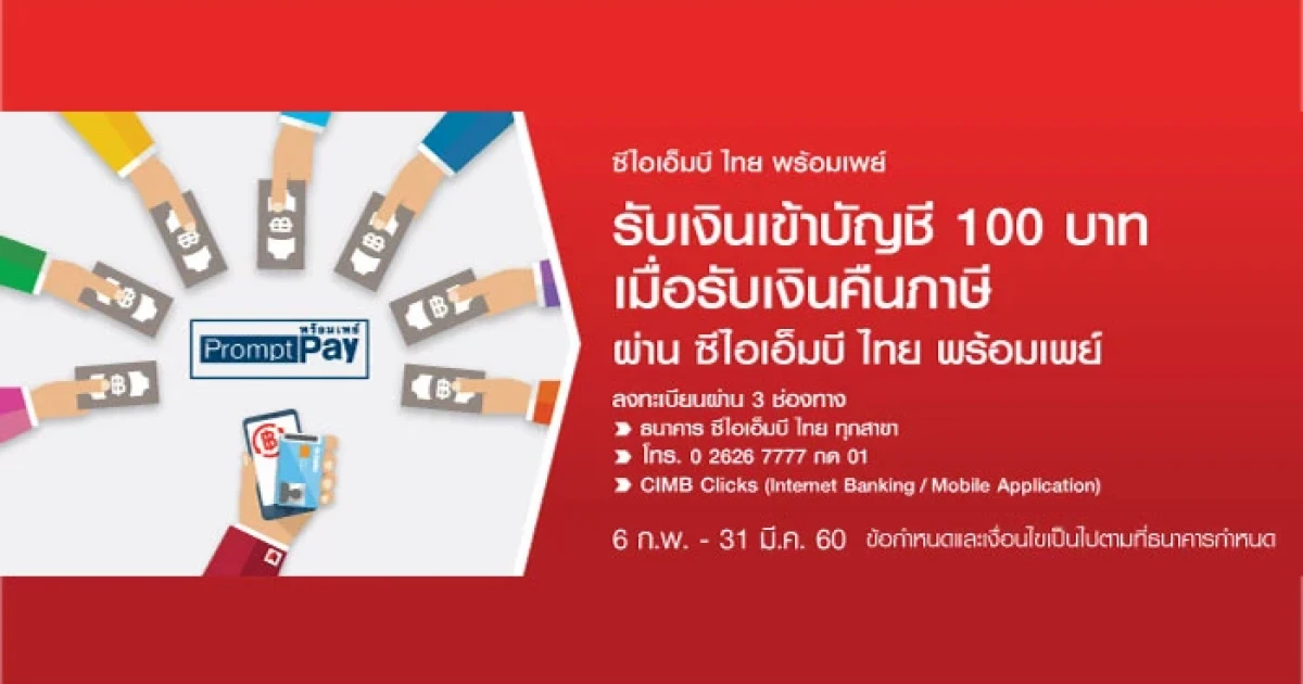 - สำหรับลูกค้าที่มีบัญชีเงินฝากออมทรัพย์หรือกระแสรายวัน กับธนาคาร ซีไอเอ็มบี ไทย ที่ลงทะเบียน ซีไอเอ็มบี ไทย พร้อมเพย์ (CIMB THAI PromptPay) ด้วยหมายเลขประจำตัวประชาชน จะได้รับเงินจำนวน 100 บาท เมื่อขอรับเงินคืนภาษี ผ่านบัญชีเงินฝากออมทรัพย์ หรือกระแสรายวันที่ลงทะเบียน ซีไอเอ็มบี ไทย พร้อมเพย์ ตั้งแต่วันที่ 6 ก.พ. - 31 มี.ค. 60