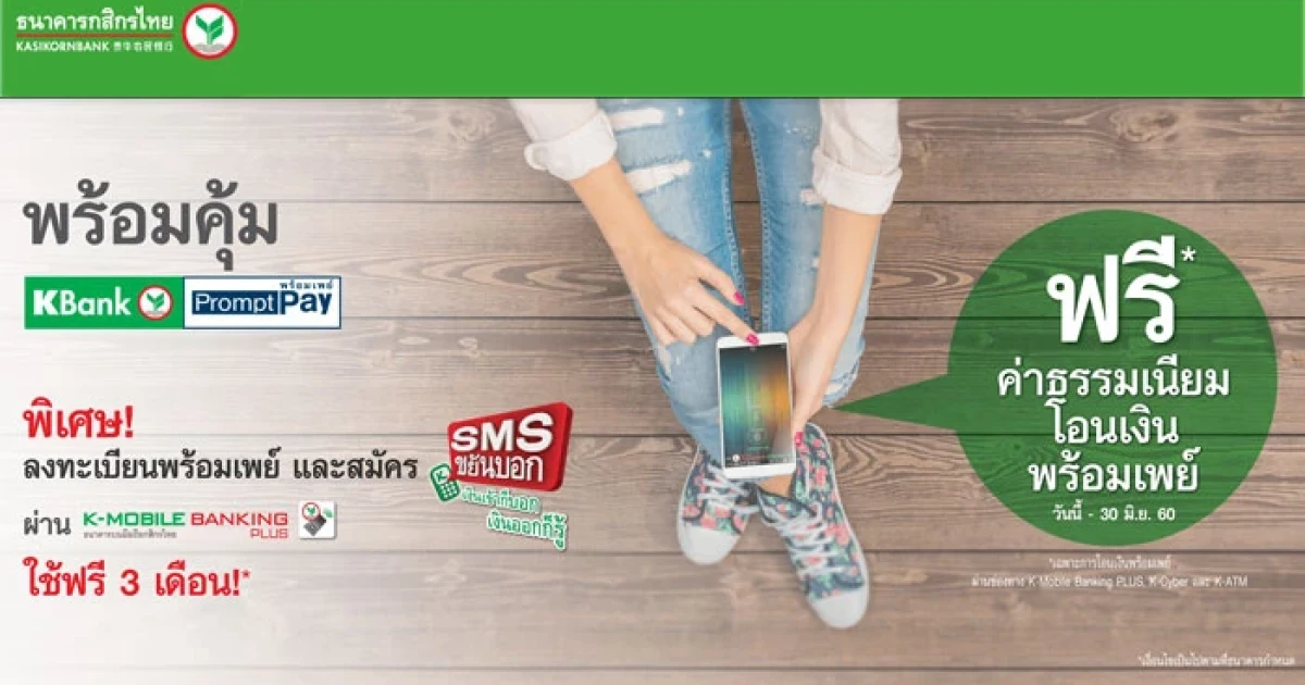 - ฟรีค่าธรรมเนียมโอนเงินพร้อมเพย์ทุกรายการ ผ่านช่องทาง K-Mobile Banking PLUS, K-Cyber และ K-ATM ตั้งแต่วันที่ 17 ก.พ. - 30 มิ.ย. 60