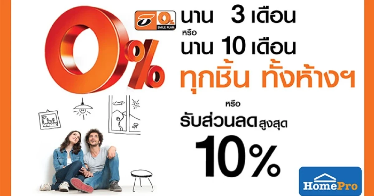 ผ่อน 0% นาน 10 เดือน หรือรับส่วนลดสูงสุด 10% เมื่อซื้อสินค้าที่ HomePro และชำระผ่านบัตรฯ ธนชาต