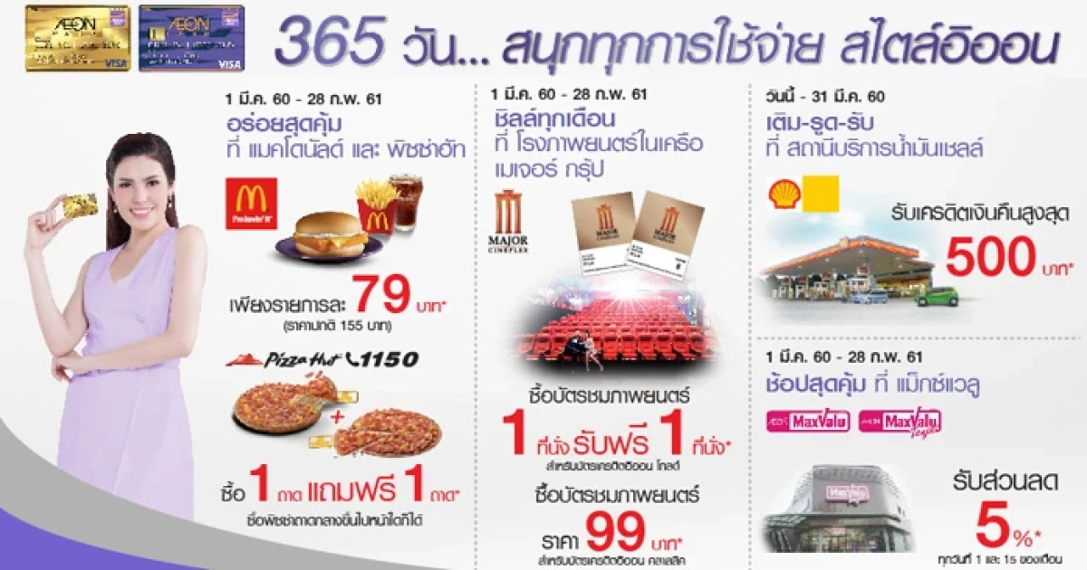 365 วัน... สนุกทุกการใช้จ่าย สไตล์อิออน รับสิทธิพิเศษจากบัตรฯ ณ ร้านค้าที่ร่วมรายการทั่วประเทศ อาทิ ร้านแมคโดนัลด์, ร้านพิซซ่า ฮัท, โรงภาพยนตร์ในเครือเมเจอร์ ซีนีเพล็กซ์, สถานีบริการน้ำมันเชลล์, แม็กซ์แวลู ซูเปอร์มาร์เก็ต และแม็กซ์แวลู ทันใจ (คลิกเพื่อสมัครบัตรเครดิตอิออน)