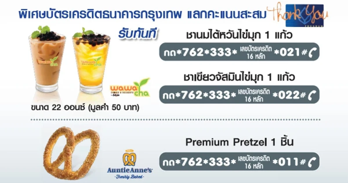 พิเศษ! ใช้คะแนนสะสมเพียง 300 คะแนน แลกรับชานมไข่มุก หรือ Premium Pretzel ณ ร้านค้าที่ร่วมรายการ