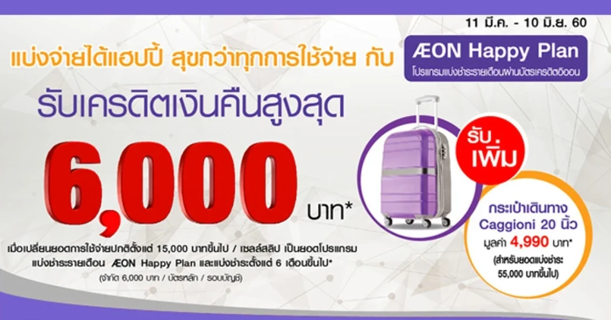 แบ่งจ่ายได้แฮปปี้ สุขกว่าทุกการใช้จ่าย กับ AEON Happy Plan รับเครดิตเงินคืนสูงสุด 6,000 บาท พร้อมรับเพิ่ม กระเป๋าเดินทาง Caggioni 20 นิ้ว มูลค่า 4,990 บาท เมื่อเปลี่ยนยอดการใช้จ่ายปกติตั้งแต่ 15,000 บาทขึ้นไป/ เซลล์สลิป จากบัตรเครดิตอิออน