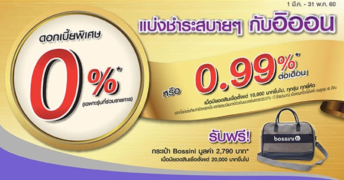 แบ่งชำระสบายๆ ดอกเบี้ยพิเศษ 0% กับอิออน พร้อมรับฟรี! กระเป๋า Bossini มูลค่า 2,790 บาท