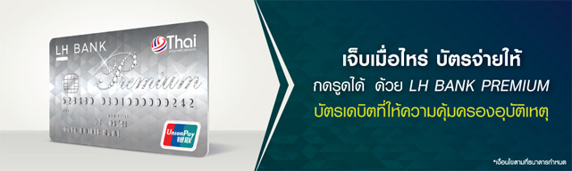 บัตรเดบิต LH Bank Premium... เป็นบัตรเดบิตที่สามารถใช้รูดซื้อสินค้า/ บริการตามร้านค้าต่างๆ ทั่วไทย ที่มีสัญลักษณ์ Thai Payment Network และ UnionPay และในต่างประเทศที่มีสัญลักษณ์ UnionPay พร้อมให้ความคุ้มครองอุบัติเหตุส่วนบุคคล วงเงินคุ้มครองสูงสุด 300,000 บาท