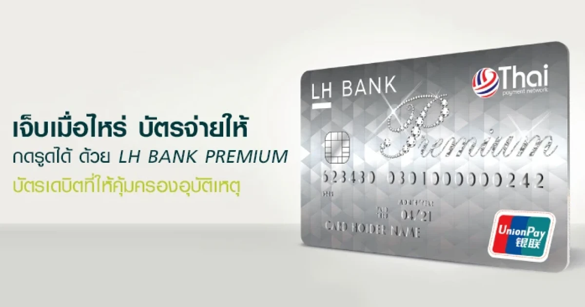 บัตรเดบิต LH Bank Premium... เป็นบัตรเดบิตที่สามารถใช้รูดซื้อสินค้า/ บริการตามร้านค้าต่างๆ ทั่วไทย ที่มีสัญลักษณ์ Thai Payment Network และ UnionPay และในต่างประเทศที่มีสัญลักษณ์ UnionPay พร้อมให้ความคุ้มครองอุบัติเหตุส่วนบุคคล วงเงินคุ้มครองสูงสุด 300,000 บาท