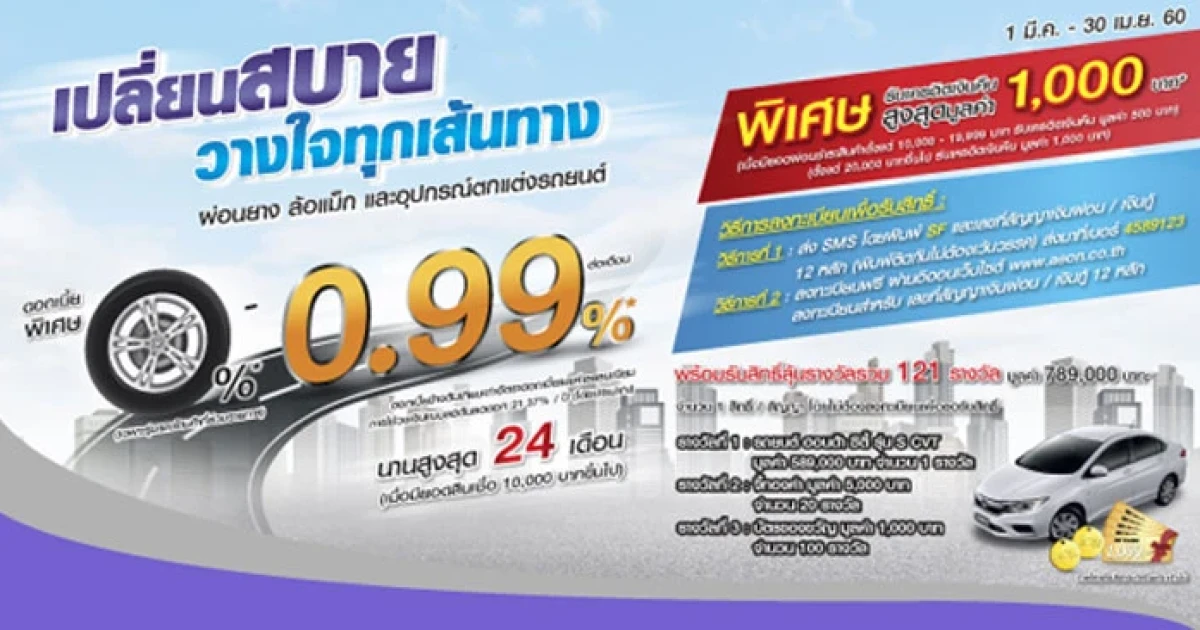 - รับอัตราดอกเบี้ยพิเศษ 0.99% นานสูงสุด 24 เดือน เมื่อผ่อนสินค้าในหมวดยางรถยนต์ ล้อแม็ก และ/หรืออุปกรณ์ตกแต่งรถยนต์ ตั้งแต่ 10,000 บาทขึ้นไป ทุกรุ่นทุกรายการ (ดอกเบี้ยข้างต้นเทียบเท่าอัตราดอกเบี้ยและค่าธรรมเนียมการใช้วงเงินแบบลดต้นลดดอก 21.37% ต่อปี โดยประมาณ)