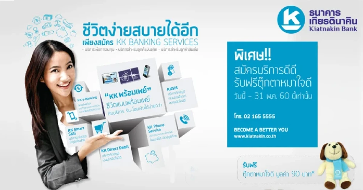 ชีวิตง่ายสบายได้อีก เพียงสมัคร KK BANKING SERVICES กับธนาคารเกียรตินาคิน ครอบคลุมทุกบริการทั้งด้านการลงทุน เงินฝาก และสินเชื่อ พิเศษ!! สมัครบริการดีดี รับฟรีตุ๊กตาหมาใจดี วันนี้ - 31 พ.ค.60 เท่านั้น