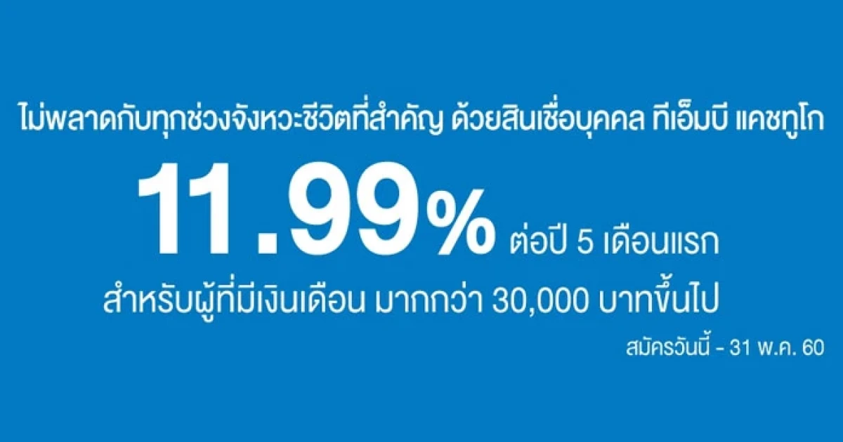 พิเศษ! ดอกเบี้ย 11.99% ต่อปี 5 เดือนแรก กับสินเชื่อบุคคล ทีเอ็มบี แคชทูโก