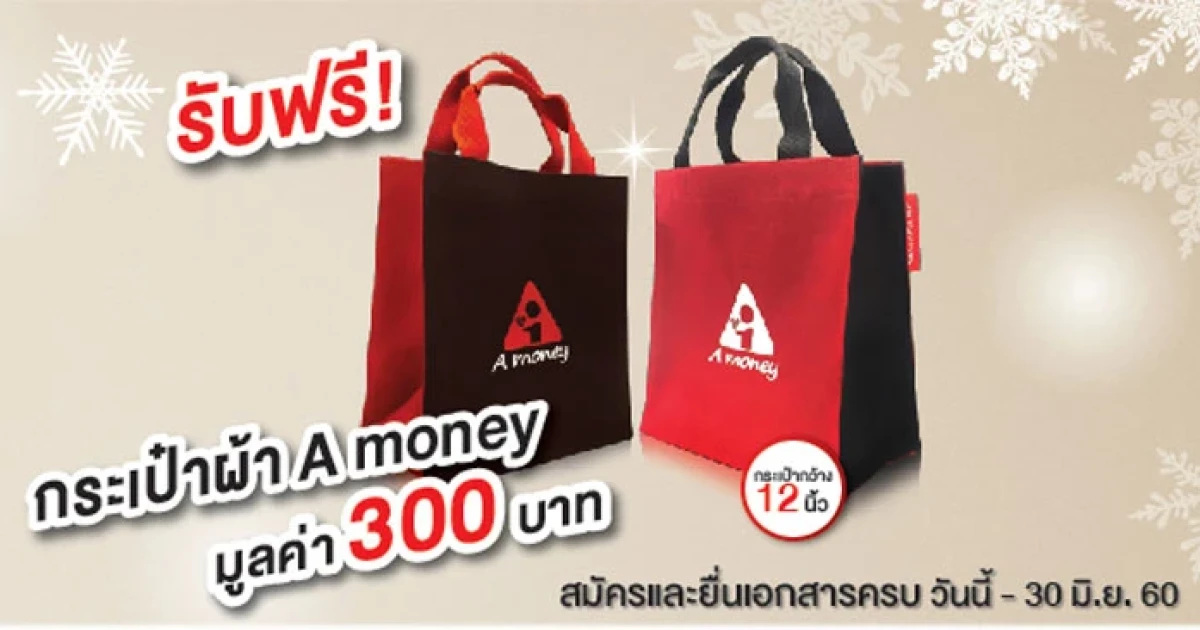 สิทธิพิเศษสำหรับผู้ที่สมัครบัตรกดเงินสด A money เพียงยื่นเอกสารครบตั้งแต่วันนี้ - 30 มิถุนายน 2560 รับไปเลย กระเป๋าผ้า A money สุดชิค ขนาด 12 นิ้ว มูลค่า 300 บาท