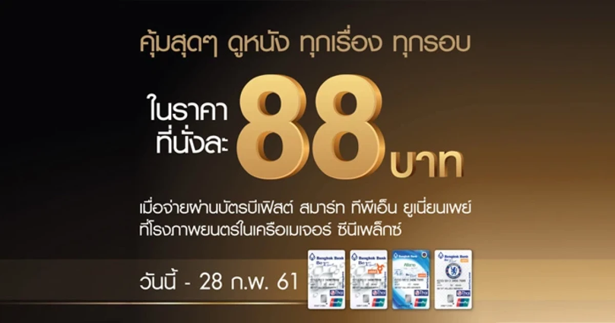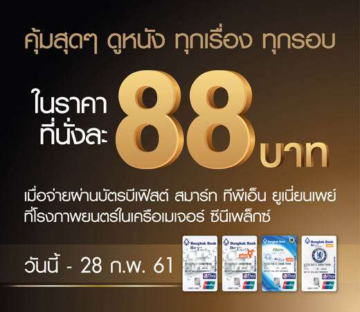 คุ้มสุดๆ ดูหนังทุกเรื่อง ทุกรอบ ที่โรงภาพยตร์ในเครือ Major Cineplex ในราคาที่นั่งละ 88 บาท เมื่อใช้จ่ายผ่านบัตร บีเฟิร์ส สมาร์ท ทีพีเอ็น ยูเนี่ยนเพย์ ธนาคารกรุงเทพ วันนี้ - 28 ก.พ.61