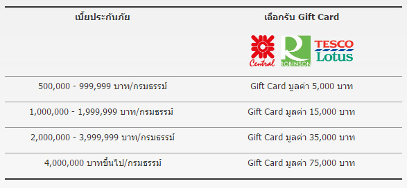 - ท่านสามารถเลือกรับบัตรกำนัล (Gift Card) ได้ 1 ห้างสรรพสินค้า/1 กรมธรรม์ เท่านั้น โดยกรอกรายละเอียดบัตรกำนัลของห้างสรรพสินค้าที่ท่านต้องการใน "แบบฟอร์มเลือกรับของสมนาคุณ" และแนบไปพร้อมกับคำขอเอาประกันชีวิต