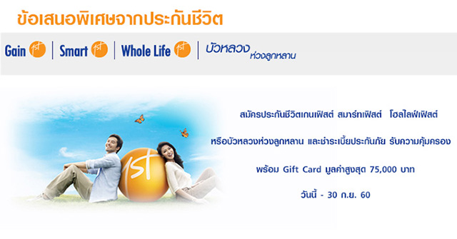 สมัครประกันชีวิตเกนเฟิสต์ สมาร์ทเฟิสต์ โฮลไลฟ์เฟิสต์ หรือบัวหลวงห่วงลูกหลาน และชำระเบี้ยประกันภัย รับความคุ้มครอง พร้อม Gift Card มูลค่าสูงสุด 75,000 บาท